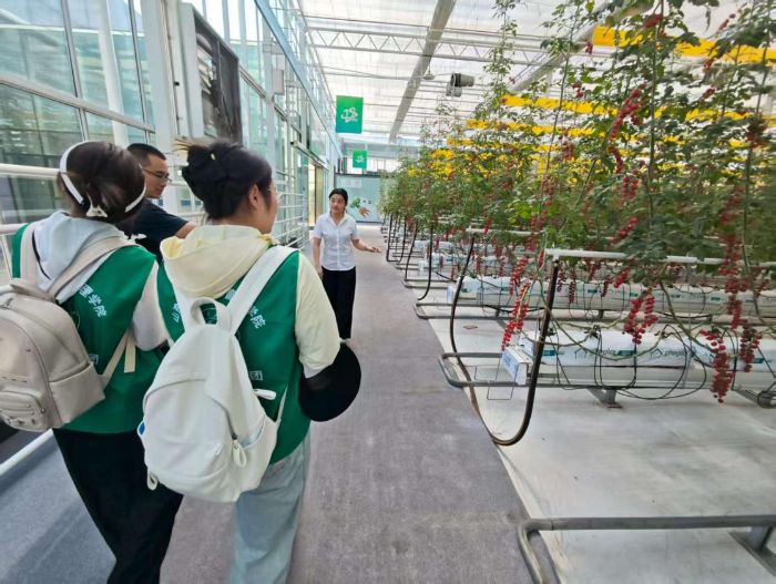 在智慧物聯(lián)移動云平臺前,實踐團成員們被眼前的景象所震撼。園區(qū)氣象、環(huán)境監(jiān)測、價格趨勢以及各個溫室里蔬菜的生長情況一目了然,工作人員通過物聯(lián)網(wǎng)控制中心,即可實現(xiàn)對園區(qū)溫室的智能化管理。“數(shù)字 + 農(nóng)業(yè)” 的深度融合,實現(xiàn)了從播種到采收的全程智能化生產(chǎn)種植,形成了一套完善可靠的全鏈條標準化、全流程可追溯的智慧種植解決方案。此外,園區(qū)還引進了荷蘭、以色列等國際先進的設(shè)施農(nóng)業(yè)裝備,與傳統(tǒng)日光溫室相比,生產(chǎn)效率大幅提升 50% 以上,為農(nóng)業(yè)現(xiàn)代化注入了強勁動力。