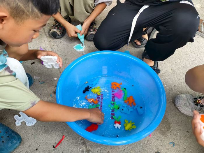 課堂上,志愿者們先通過(guò)看視頻的講解,用孩子們能聽(tīng)懂的語(yǔ)言介紹了水精靈的制作原理——原來(lái)那些五顏六色、QQ彈彈的小玩意兒,是海藻酸鈉溶液遇到氯化鈣溶液后發(fā)生的奇妙化學(xué)反應(yīng)。隨后,大家分組行動(dòng),手把手教孩子們操作:有的孩子小心翼翼地用滴管將彩色溶液滴入水中,看著一個(gè)個(gè)小球慢慢成形;有的則發(fā)揮想象力,用模具做出星星、愛(ài)心等形狀,室外滿是歡聲笑語(yǔ)。
