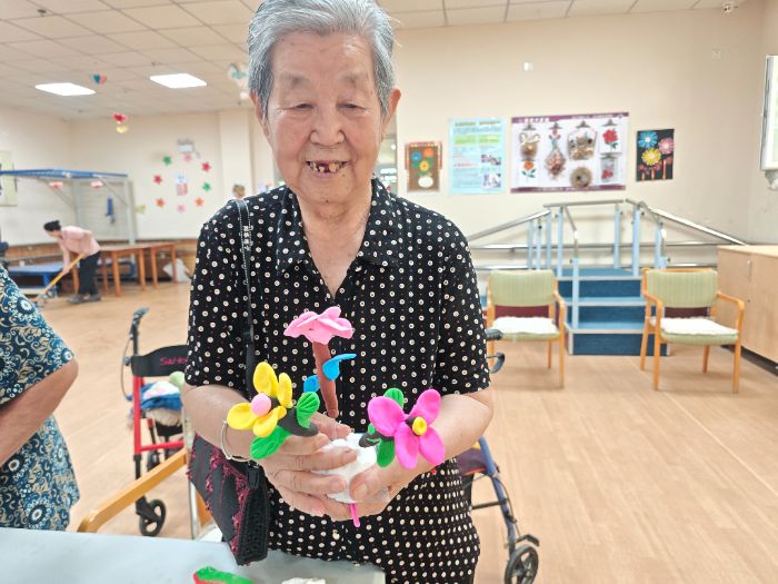 在阿拉爾市銀齡大家庭老年公寓,同樣的藝術(shù)與自然元素為長(zhǎng)者們帶來(lái)了歡樂(lè)與活力。隊(duì)員們耐心帶領(lǐng)老人們用粘土捏塑各種模型,重溫手工制作的樂(lè)趣;一起編織象征吉祥的扭扭棒柿子掛件,現(xiàn)場(chǎng)洋溢著溫馨與成就感。隊(duì)員們細(xì)致觀察到,老人們?cè)诨顒?dòng)中的專注神情、遇到困難時(shí)像孩子般尋求幫助的模樣,以及作品完成時(shí)展現(xiàn)的純真笑容,其語(yǔ)言和行動(dòng)中流露出的簡(jiǎn)單快樂(lè),竟與幼兒園的孩子們?nèi)绱讼嗨啤_@一跨越年齡的奇妙共鳴,讓隊(duì)員們深切體會(huì)到“老小孩”這一說(shuō)法的生動(dòng)內(nèi)涵——歲月或許改變了容顏,但對(duì)快樂(lè)、創(chuàng)造和陪伴的渴望,那份源自生命本真的純真與熱情,在人生的兩端竟如此的相通。