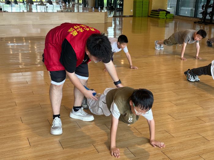 游泳體能練協(xié)調(diào)堅持鍛煉鑄毅力 在邗源社區(qū)的協(xié)調(diào)下,活動場地設在揚州市游泳健身中心室內(nèi)。蘇州大學應用技術(shù)學院“清遠”實踐團的成員們?nèi)f(xié)助揚州市游泳健身中心的培訓教練,帶領(lǐng)孩子們開展了各種各樣的體能激活和健身運動,包括熱身環(huán)節(jié)、協(xié)調(diào)性訓練、站立平衡、拉伸等內(nèi)容,讓孩子們在玩樂中提升身體的協(xié)調(diào)能力。在課程中,實踐團成員們細心觀察與耐心引導糾正孩子們的動作,及時給予孩子們幫助和鼓勵。通過這些基本的體能訓練,不僅有效鍛煉了孩子們的身體,增強了他們的體力,更培養(yǎng)了他們堅持不懈的毅力。