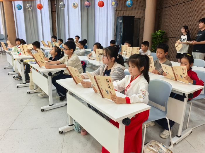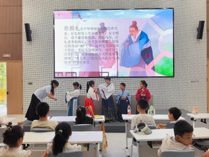 除此之外,實踐團成員們還現(xiàn)場示范了作揖禮的正確姿勢,左手在外,右手在內(nèi),雙手合抱于胸前,微微彎腰,體現(xiàn)了對他人的尊重。孩子們跟著模仿學習,紛紛舉起小手,向老師和同伴恭敬作揖,在潛移默化中學會了古時的規(guī)矩,涵養(yǎng)了良好的品德。活動的最后,實踐團成員們還帶領(lǐng)孩子們誦讀《弟子規(guī)》。孩子們用稚嫩而認真的聲音,逐句朗讀經(jīng)典,感受中華文化的深厚底蘊。