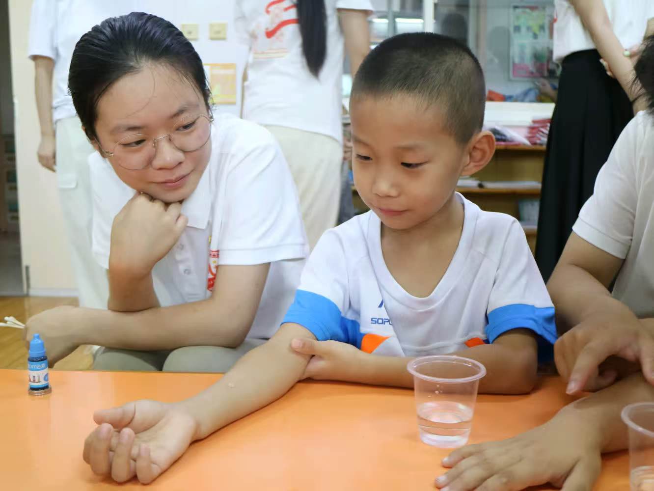 在趣味科學實驗戳破水的“魔法膜”環(huán)節(jié)中,孫萌為孩子們演示水的“小魔力”現(xiàn)象。其他實踐團成員引導兒童觀察滴入彩色墨水的清水,當蘸有洗潔精的棉簽觸碰水面中心時,墨水因表面張力變化迅速擴散。該實驗將復雜的科學原理轉(zhuǎn)化為孩子們喜愛的“魔法”故事,幫助兒童理解科學原理。