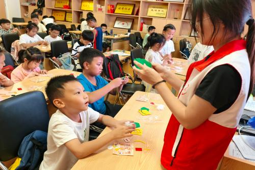 隨后的不織布掛件DIY環(huán)節(jié),志愿者手把手指導(dǎo)縫制技法,協(xié)助孩子們裁剪縫制。從愛心、星星到萌趣動物,一件件獨特掛件在協(xié)作中誕生,孩子們在動手實踐中提升創(chuàng)造力,更深化了安全認知。