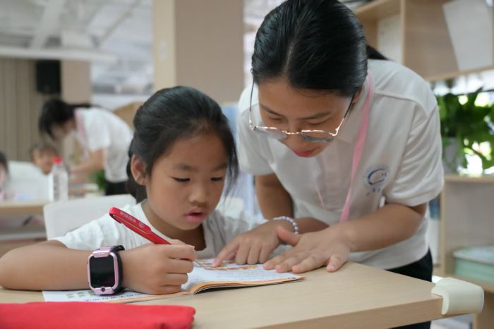 圖為志愿者馮小鳳為小朋友講解暑假習(xí)題張錫松供圖