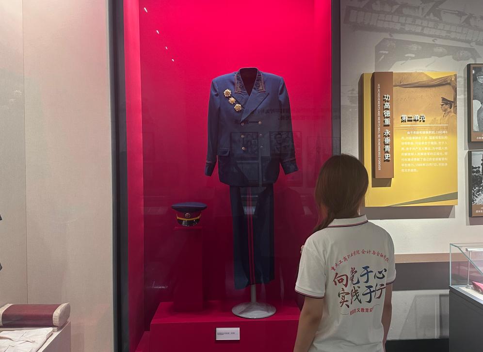 圖為實(shí)踐團(tuán)成員細(xì)細(xì)打量軍神曾穿過的軍裝團(tuán)隊(duì)供圖