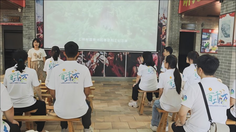 為充分挖掘當(dāng)?shù)匚幕ㄔO(shè)亮點(diǎn),豐富視頻拍攝優(yōu)質(zhì)素材,突擊隊前往上林村進(jìn)行踩點(diǎn)。在劉梁煒老師和村干部馮少英的引領(lǐng)下,隊員們懷著崇敬之心,先后參觀了上林三十二烈士紀(jì)念館和上林村史館。馮少英委員的生動講解,讓隊員們深刻感悟到上林村深厚的紅色文化底蘊(yùn),先輩們的精神力量也在隊員們心中激蕩。