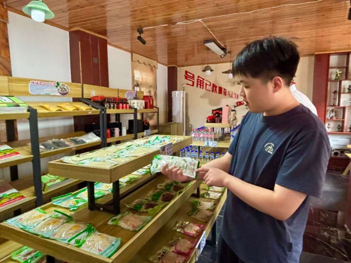 圖4.志愿者潘勇康為實踐隊員介紹嶺下村農(nóng)副產(chǎn)品