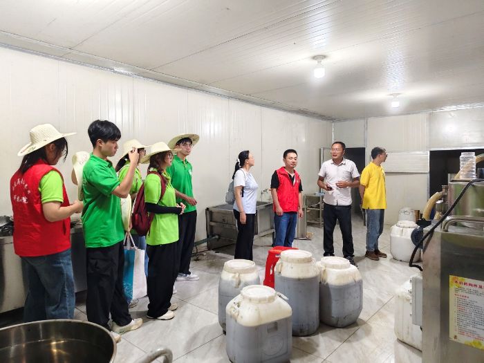 張為露帶領(lǐng)實(shí)踐隊(duì)員們進(jìn)入生產(chǎn)車間,一打開門濃郁的蜂蜜甜香便撲面而來。他詳細(xì)講解了蜂蜜從采集到加工的全流程,并介紹了蜂臺(tái)、熊蜂、王臺(tái)等專業(yè)名詞。參觀間隙,他親自為實(shí)踐隊(duì)員們沖泡蜂蜜水,金黃的蜜汁在熱水中緩緩化開,輕抿一口,清甜的滋味在舌尖綻放,讓人不禁感嘆大自然的饋贈(zèng)和養(yǎng)蜂人的匠心。