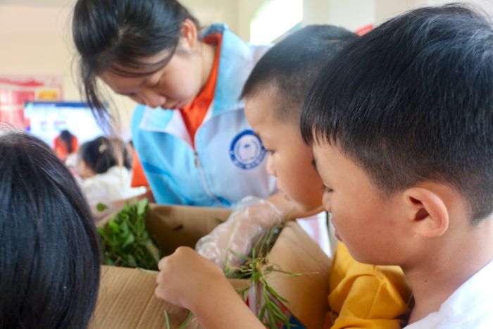 圖為團(tuán)隊(duì)成員與小朋友挑選植物 張慧敏攝。