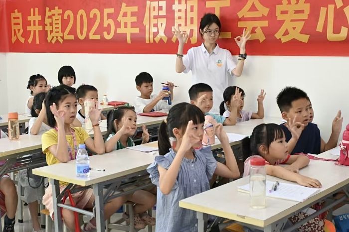 圖為廣東科技學(xué)院惠藝啟樓突擊隊(duì)老師與孩子們一起學(xué)手勢(shì)舞(李宗桓攝)