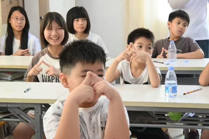 圖為孩子們學(xué)手勢(shì)舞(張鐘寧攝)