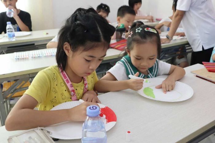 壓軸的繪畫課緊扣良井鎮(zhèn)特色,開展“紙盤水果樂園”創(chuàng)作。隊(duì)員通過對(duì)比菠蘿與鳳梨的形態(tài)差異,深化孩子對(duì)本土農(nóng)產(chǎn)品的認(rèn)知。孩子們?cè)诩埍P上繪制心中的水果形態(tài),從鉛筆草稿到馬克筆上色,實(shí)踐隊(duì)員們教授的“同一方向填涂”的繪畫技巧。課程融入鄉(xiāng)村振興主題,鼓勵(lì)孩子用畫筆設(shè)計(jì)各類形態(tài)的水果,將良井果園的豐饒圖景凝于方寸紙盤之間。