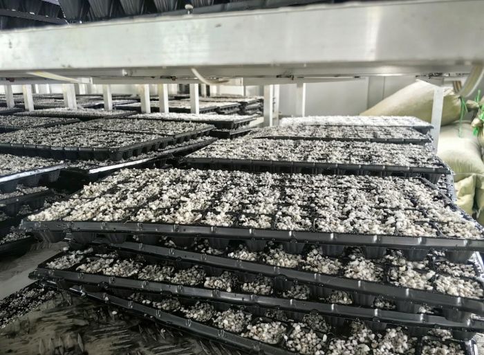 育苗車間:機(jī)藝結(jié)合,開啟高效育種新篇實(shí)踐團(tuán)首先來到育苗基地的播種車間,映入眼簾的是一條自動(dòng)化播種生產(chǎn)線。在負(fù)責(zé)人的介紹下,成員們了解到,基地通過“機(jī)器播種 + 人工補(bǔ)位”的模式,實(shí)現(xiàn)了育苗流程的高效運(yùn)轉(zhuǎn)。“種子從投放、覆土到珍珠巖覆蓋,全程由機(jī)器完成,僅需5名工人配合操作即可。”負(fù)責(zé)人指著生產(chǎn)線介紹道。