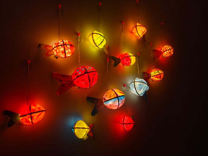 推開工作室大門,一股裹挾著歲月的古樸氣息撲面而來,空氣中彌漫著濃厚的手工溫度。墻上懸掛的成品魚燈尤為驚艷——紅似烈焰、金若朝陽,細密絲線勾勒的鱗片在光影中微微顫動,仿佛下一秒就要擺尾游動。
