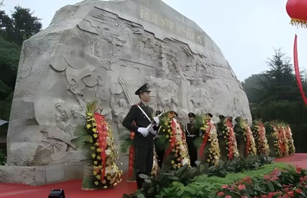 在清晨初陽的映照下,軍人們肅立于“江淮英烈永垂不朽”金色紀念碑前,向先烈敬獻花籃并默哀,氛圍莊嚴肅穆,充滿敬意。