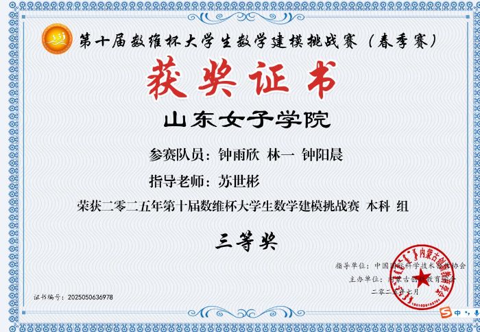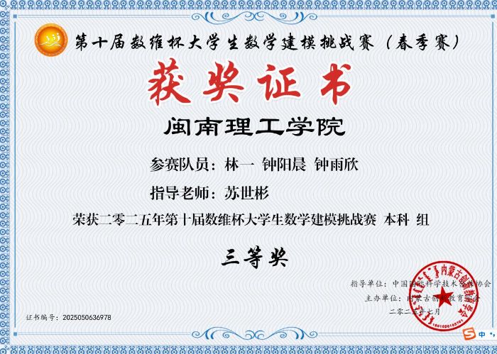 近日,由福州大學(xué)“競(jìng)賽成就未來(lái),規(guī)劃精彩人生”實(shí)踐隊(duì)指導(dǎo)的跨校合作團(tuán)隊(duì)在2025年第十屆數(shù)維杯大學(xué)生數(shù)學(xué)建模挑戰(zhàn)賽(春季賽)中表現(xiàn)優(yōu)異,閩南理工學(xué)院、山東女子學(xué)院的三名學(xué)子鐘陽(yáng)晨、鐘雨欣、林一在福州大學(xué)經(jīng)濟(jì)與管理學(xué)院工商管理系蘇世彬副教授的指導(dǎo)下,榮獲本科組三等獎(jiǎng)。這一成果充分展現(xiàn)了實(shí)踐隊(duì)“以賽促學(xué)、跨校聯(lián)動(dòng)”的創(chuàng)新實(shí)踐模式,為高校學(xué)科競(jìng)賽與社會(huì)實(shí)踐融合提供了新思路。