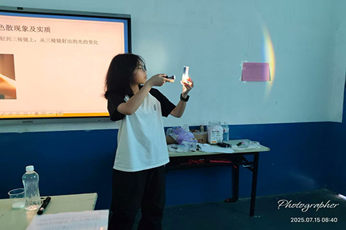 7月4日至21日,湘潭大學(xué)金翼5·1·8愛心團隊赴湘潭市湘潭縣譚家山鎮(zhèn)紫竹村暑期社會實踐團(以下簡稱“實踐團”)在紫竹村“榴蓮夏令營”中推出科學(xué)系列課程,圍繞光學(xué)、聲學(xué)及趣味化學(xué)三大板塊,為鄉(xiāng)村兒童們帶來一場“看得到、聽得見、摸得著”的夏日科學(xué)盛宴,點燃了孩子們探索未知的熱情。