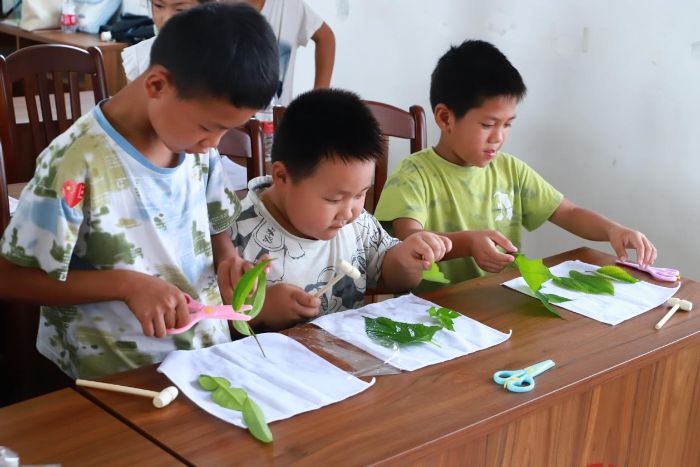 村委會(huì)議室里此起彼伏地回響著“噠噠噠噠噠”的敲擊聲,孩子們專心的敲擊著自己的作品。老師們穿梭其間,指導(dǎo)學(xué)生們先從植物的邊緣開始,沿著輪廓輕輕敲擊,使植物的形狀初步印在棉布上,然后逐漸向植物的內(nèi)部敲擊。在敲擊時(shí)要有節(jié)奏地敲擊,這樣可以使色素更均勻地滲出,圖案更加清晰。