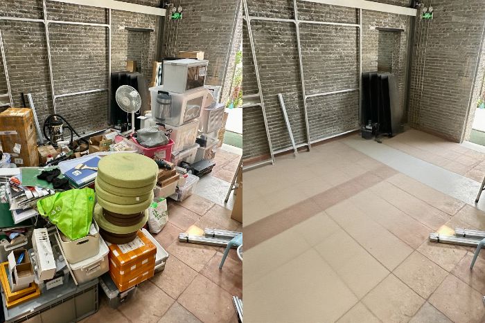 男生主動負(fù)責(zé)搬運(yùn)重物,兩人一組穩(wěn)穩(wěn)抬起厚重的舊木板,小心避開地面的凸起和脆弱的蠔殼墻面。女生則專注整理零散物件,細(xì)致搬運(yùn)架子上的物品。彼此配合間,現(xiàn)場忙碌而有序。