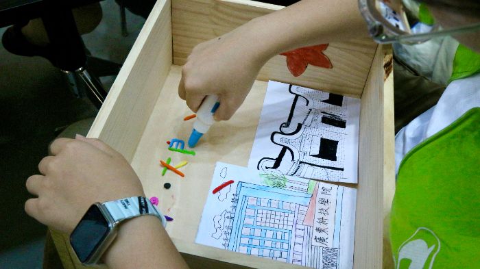 1、DIY展品箱時,我們將廣東科技學(xué)院南門按比例縮小復(fù)刻,行政樓上“創(chuàng)百年學(xué)府,育產(chǎn)業(yè)精英”的標(biāo)語清晰可辨,每道刻痕都是對學(xué)校的深情告白。