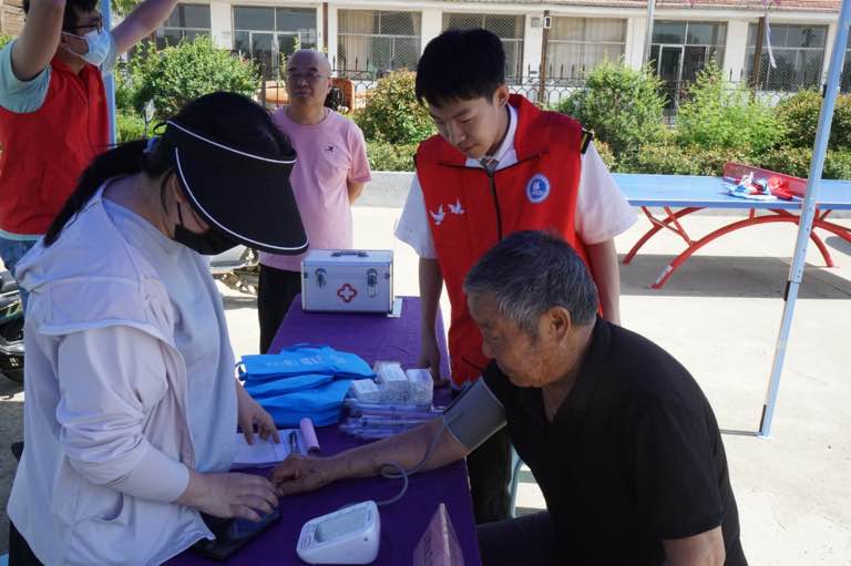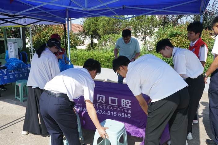 隨后,志愿者們手持健康宣傳冊,走進村里的巷道院落,挨家挨戶進行宣傳。“大姨,今天村委有免費義診,能測血壓、檢查眼睛和牙齒,您去看看吧”,志愿者們用親切的方言耐心講解,詳細介紹義診的內(nèi)容,熱情邀請村民參與,讓更多人知曉并受益。義診正式啟動后,志愿者們他們協(xié)助醫(yī)護人員引導(dǎo)村民有序排隊、登記信息,對于行動不便的老人,主動上前攙扶陪診當村民對醫(yī)療術(shù)語不理解時,志愿者們及時進行“翻譯”,用通俗易懂的語言解釋,讓村民能清楚了解自己的健康狀況。在日照漱玉平民大藥房的攤位前,志愿者們幫忙遞拿資料,協(xié)助醫(yī)護人員為村民測骨密度、血壓;在愛爾眼科的檢查點,他們維持秩序,引導(dǎo)村民進行視力檢查;在瑞貝口腔的宣傳區(qū),志愿者們跟著學(xué)習(xí)護牙知識,并向村民同步宣傳。從晨光熹微到日過晌午,志愿者們始終保持著熱情,用奔跑的身影和耐心的服務(wù),保障了義診流程的順暢。