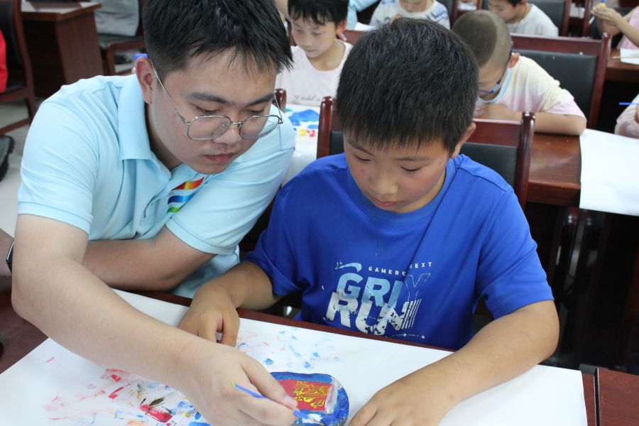 緊接著是“和美育人,美美與共”創(chuàng)意繪畫篇。志愿者們?yōu)楹⒆觽儨?zhǔn)備了光滑的石頭和五顏六色的顏料,耐心指導(dǎo)他們在石頭上勾勒線條、填充色彩。孩子們充分發(fā)揮想象力,有的繪制了藍(lán)天下?lián)u曳的五星紅旗,有的畫起了可愛的小動物,有的描繪了美麗的自然風(fēng)光,一塊塊普通的石頭在他們手中變成了獨(dú)具特色的藝術(shù)品,孩子們也在創(chuàng)作中體驗到了繪畫的樂趣和繪畫帶來的成就感。