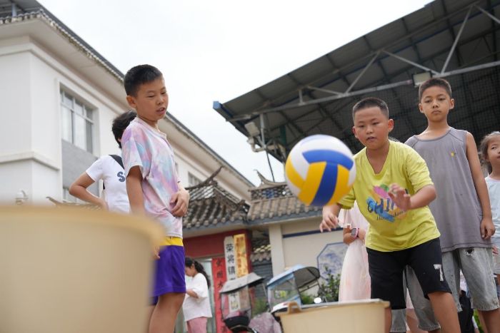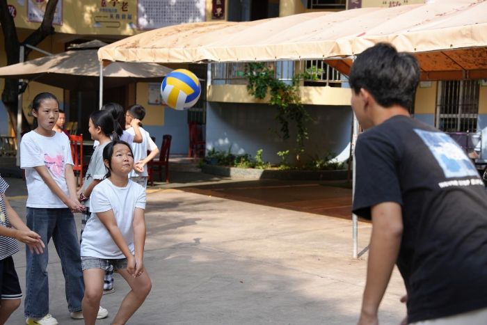 中期課程中,孩子們走出教室,進行體育素質拓展,團隊成員結合兒童身體特點,開展趣味排球課,設計“墊球小游戲”“團隊傳球接力”等環(huán)節(jié),從握球姿勢到基礎墊球,循序漸進引導孩子們感受排球運動的協(xié)作魅力。課間休息時,孩子們追著志愿者請教“怎么才能墊得更穩(wěn)”,小小的排球成了拉近彼此距離的“新紐帶”。