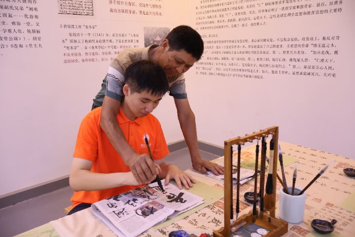 在非遺體驗區(qū),團(tuán)隊成員親身體驗了書法創(chuàng)作和串珠工藝。智能2301班張宇在完成一幅"文化傳承"的書法作品后表示:"每一筆都讓我感受到傳統(tǒng)文化的厚重。"同班的譚育康在制作串珠時感嘆:"這些看似簡單的工藝,實則蘊(yùn)含著匠人們世代相傳的智慧。"
