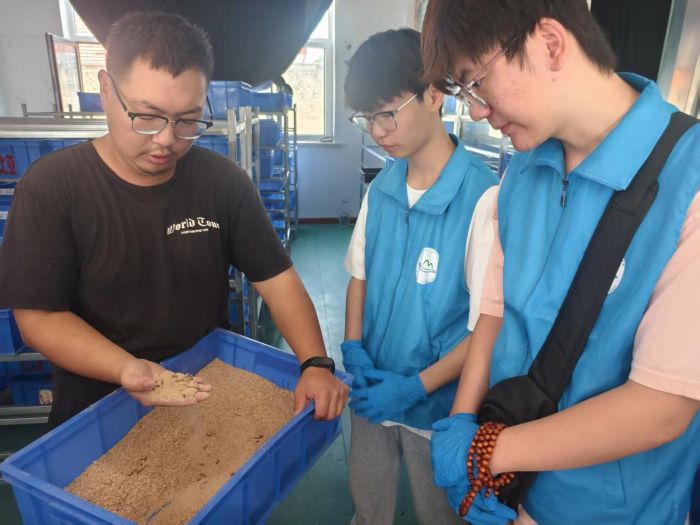 異蟲培育是爬寵食品產(chǎn)業(yè)中的一個重要環(huán)節(jié)。技術(shù)人員向?qū)嵺`團(tuán)成員解釋,異蟲培育即將異蟲培育至完全變態(tài),技術(shù)人員以目前企業(yè)培育的主要品類大麥蟲為例詳細(xì)介紹了異蟲的生長環(huán)境、繁殖技術(shù)等方面的知識。在飼料方面,大麥蟲的培養(yǎng)以麩子和蔬菜的混合物為主,營養(yǎng)配比經(jīng)過專業(yè)調(diào)配以滿足其生長需求。值得注意的是,大麥蟲體質(zhì)較脆弱,對生長環(huán)境要求極高,必須保證無毒無菌,因此培育場地需要定期進(jìn)行嚴(yán)格的消毒殺菌,確保環(huán)境達(dá)標(biāo)。目前,這些培育成熟的異蟲已投入生產(chǎn)銷售,受眾群體主要為寵物食品領(lǐng)域。實(shí)踐團(tuán)成員們親自參與了異蟲的日常管理工作,如喂食、清潔和觀察生長情況等。通過實(shí)際操作,成員們不僅學(xué)到了專業(yè)的養(yǎng)殖知識,還培養(yǎng)了自己的耐心和責(zé)任心。