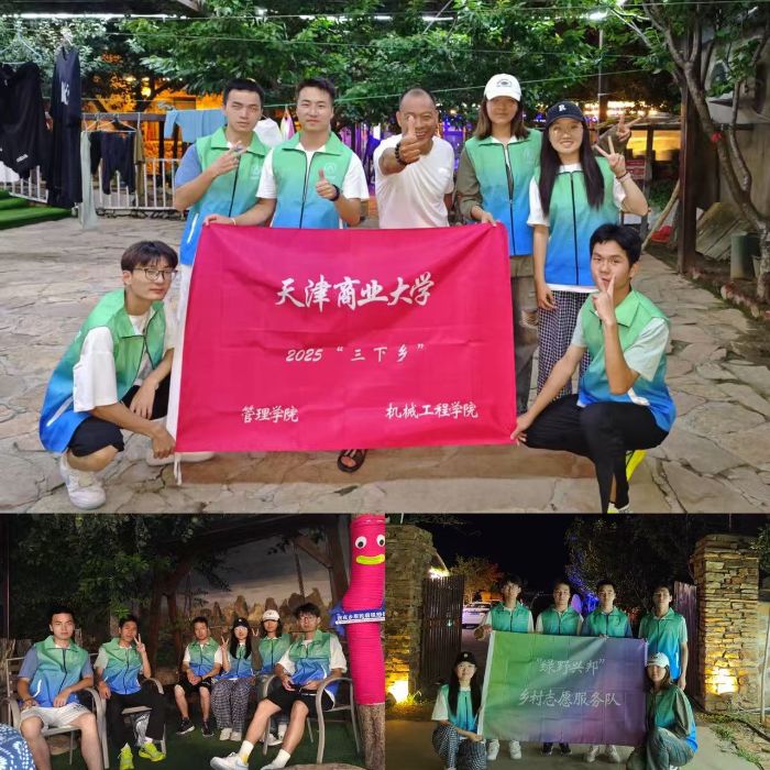 這是天津商業(yè)大學(xué)管理學(xué)院與機械工程學(xué)院聯(lián)合組成的實踐團隊,在2025年“三下鄉(xiāng)”活動中與農(nóng)家院網(wǎng)紅老板的合影。