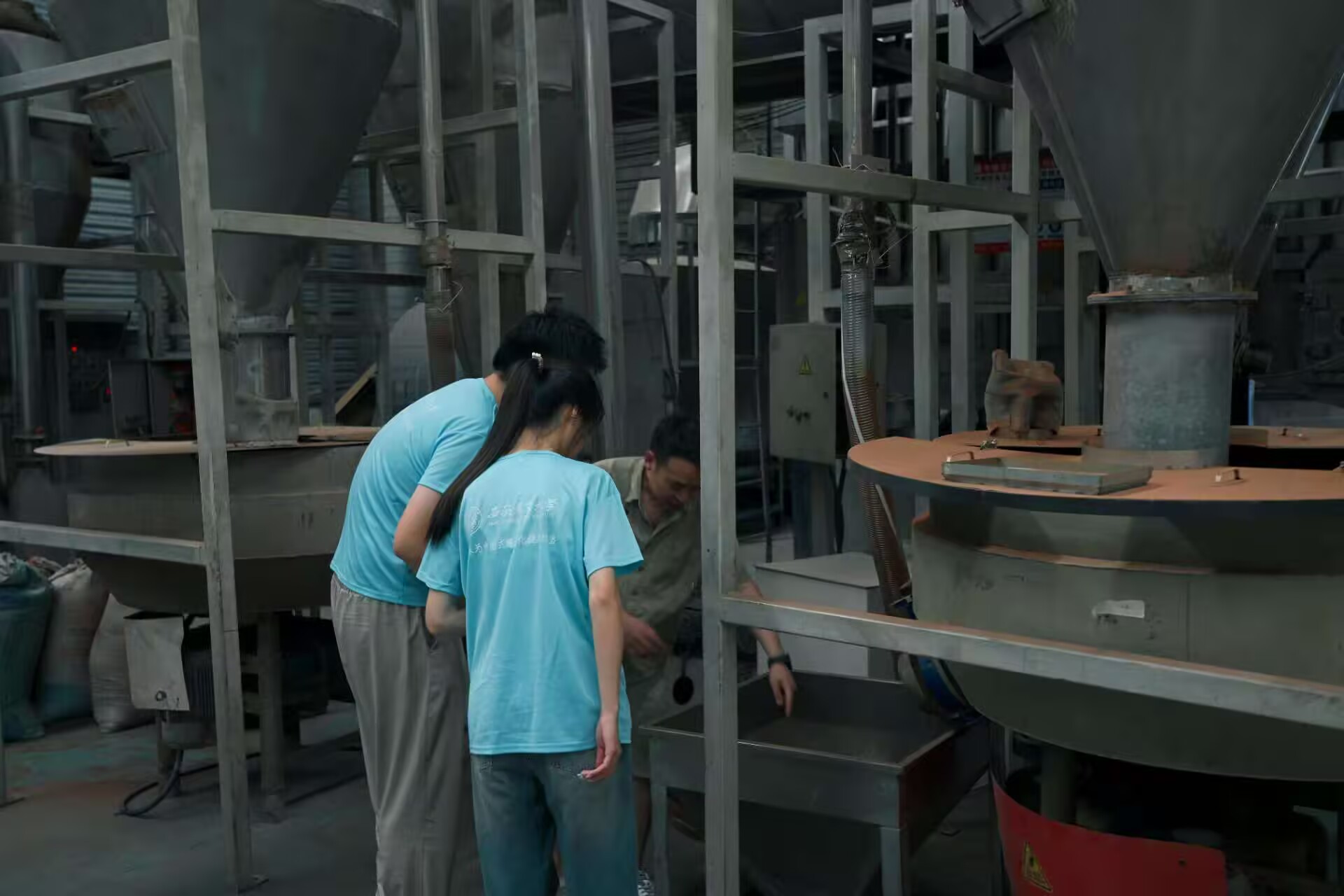 圖為森泰負(fù)責(zé)人帶領(lǐng)團(tuán)隊(duì)成員參觀生產(chǎn)車(chē)間圖