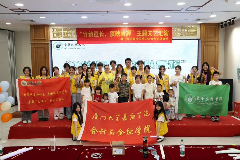 【廈門大學(xué)嘉庚學(xué)院7月27日訊】為響應(yīng)國(guó)家關(guān)于全面推進(jìn)鄉(xiāng)村振興、繁榮發(fā)展鄉(xiāng)村文化的號(hào)召,2025年7月26日,廈門大學(xué)嘉庚學(xué)院會(huì)計(jì)與金融學(xué)院“助學(xué)傳遺興竹藝,共繪邵武新圖景”實(shí)踐隊(duì)走進(jìn)邵武市文化館,精心組織并呈現(xiàn)了主題為“竹韻恒長(zhǎng),演映青輝”的文藝匯演。實(shí)踐隊(duì)隊(duì)員們以青春熱情與藝術(shù)才華,給當(dāng)?shù)鼐用駧砹艘粓?chǎng)形式多樣、精彩紛呈的文藝表演,生動(dòng)展現(xiàn)了青年學(xué)子服務(wù)鄉(xiāng)村、奉獻(xiàn)社會(huì)的精神風(fēng)貌,為鄉(xiāng)村文化振興注入青春動(dòng)能。