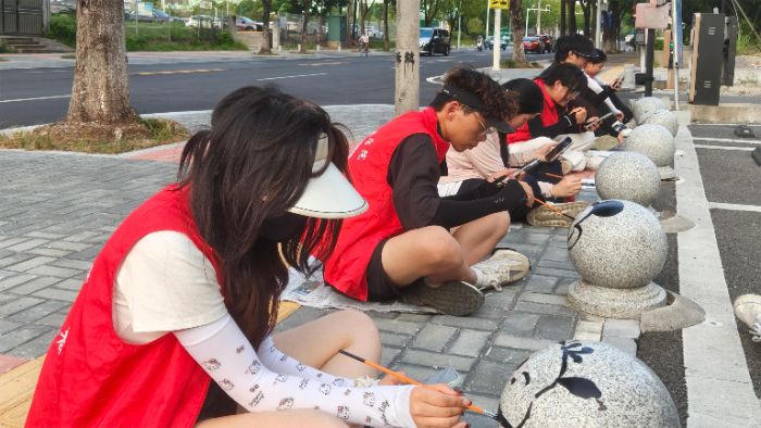 街頭石墩旁,隊(duì)員們身著紅馬甲專注創(chuàng)作,以筆為媒,讓文明悄然浸潤城市角落,用青春色彩點(diǎn)亮社區(qū)顏值,繪就共建美好家園的生動圖景。