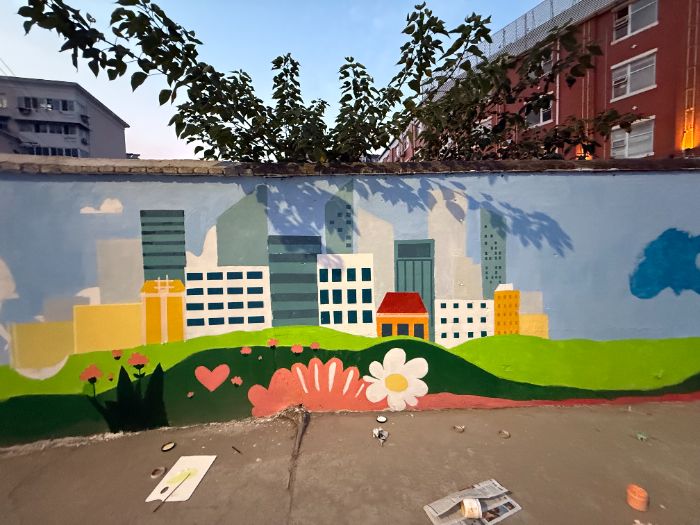 在宜昌市西陵區(qū)黃河路社區(qū),斑駁墻垣前,實(shí)踐隊(duì)員變身“城市美容師”。烈日之下,調(diào)色盤與滾筒共舞,丙烯顏料將陳舊污跡覆蓋。隊(duì)員們緊扣社區(qū)文化基因,打造系列主題墻繪:蔥郁山林與現(xiàn)代樓宇相融的“生態(tài)宜昌”畫卷,讓灰暗墻體蛻變成傳播文明的“開放式美術(shù)館”,引得居民駐足笑嘆:“如今回家,就像漫步風(fēng)景里!”