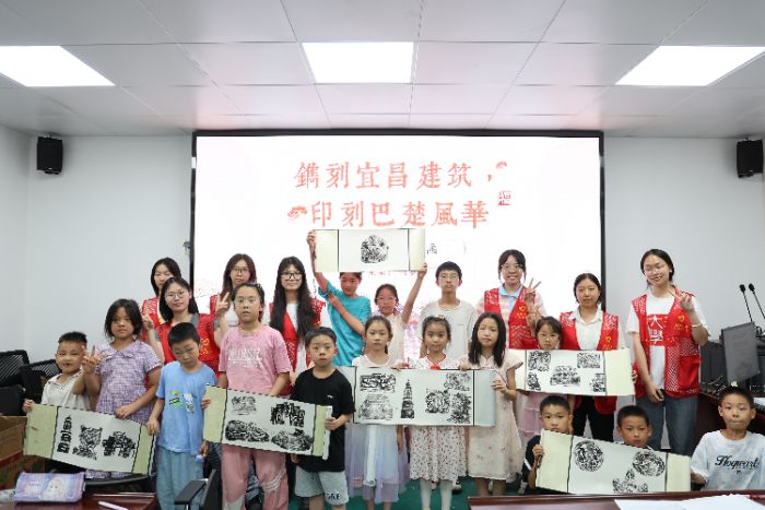 在“版畫繪家鄉(xiāng)”課堂,孩子們以竹簽為刀,吹塑板為“版”。在隊(duì)員指導(dǎo)下,稚嫩的刻刀游走于板面,三峽大壩、宜昌長江大橋、天然塔等宜昌的記憶意象漸次浮現(xiàn)。墨輥滾過,宣紙輕拓,一張張黑白分明、線條質(zhì)樸的“家鄉(xiāng)印象”躍然紙上。