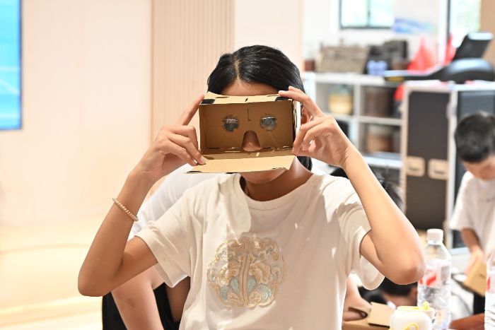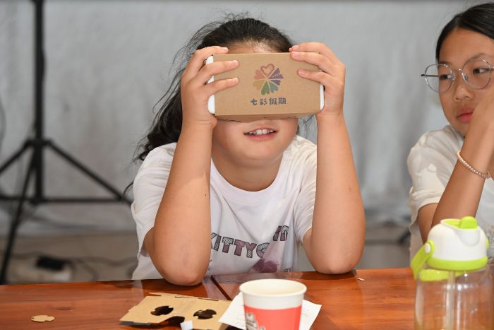 隨著講座的深入,孩子們的眼神中閃爍著好奇與渴望。他們迫不及待想要親手制作VR眼鏡,探索這個全新的世界。在支教團成員的指導下,孩子們分成小組,開始動手制作VR眼鏡。他們小心翼翼地拆解包裝、組裝鏡片、調整焦距,每一個步驟都充滿了探索的喜悅。