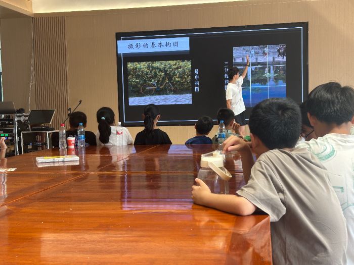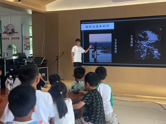 隨后的課程重點介紹了多種實用構圖技巧,如引導視覺焦點的“九宮格構圖法”、展現穩(wěn)定與莊重的“對稱式構圖”、創(chuàng)造動感與延伸感的“對角線構圖”以及營造空間意境美的“留白構圖”等。支教老師結合自己拍攝的照片實例進行講解,引導孩子們觀察畫面布局之美。