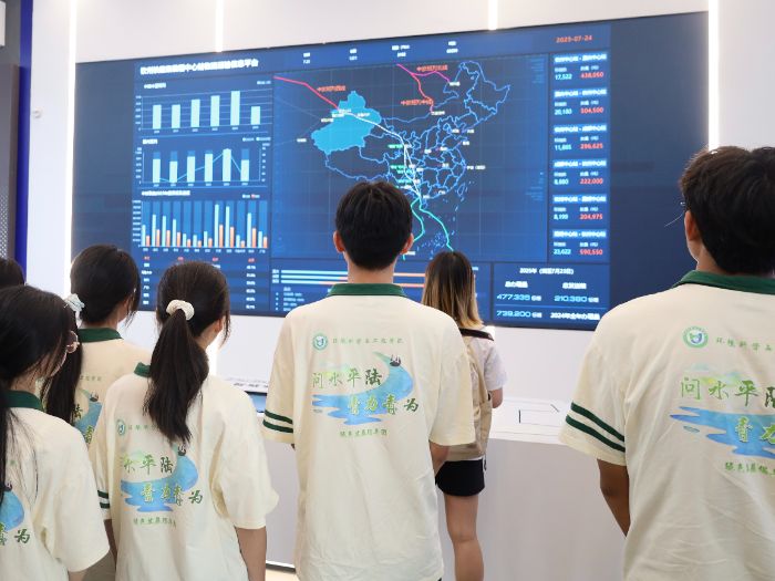 圖為同學(xué)們觀看碼頭實時監(jiān)控物流數(shù)據(jù)(通訊員楊婷媛攝)