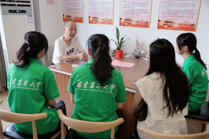 圖為老黨員林國棟向?qū)嵺`隊員講述木蘭溪治理往事。李鵬駿供圖