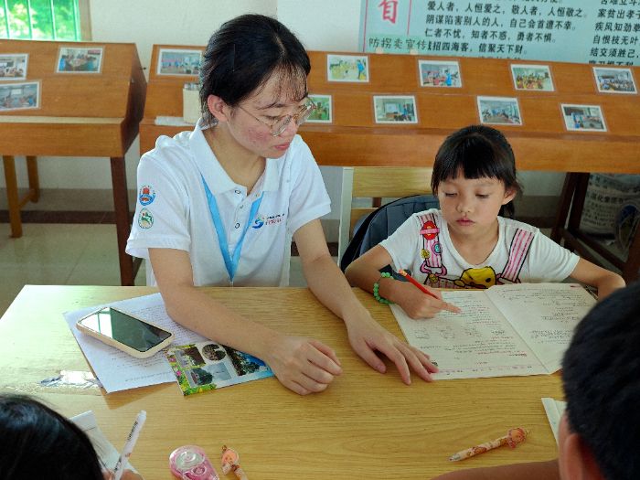 圖為“筑愛(ài)興鄉(xiāng)”突擊隊(duì)隊(duì)員在輔導(dǎo)兒童作業(yè)。劉澤熙 攝