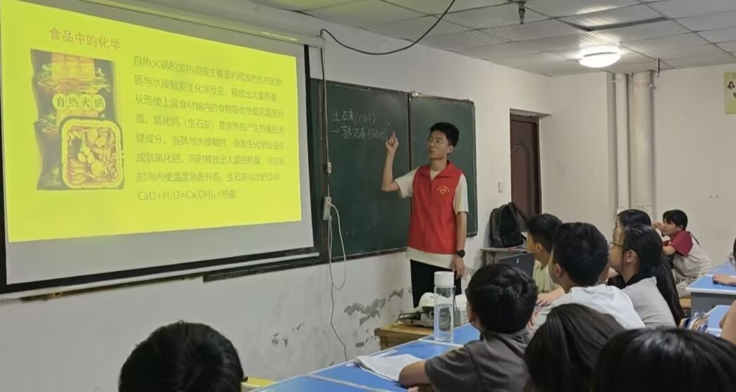 講解過程中,孩子們充滿了好奇,紛紛提問:“為什么檸檬汁能讓蘋果不變黑?”“自熱包里的東西是什么?”“蚊子包為什么會(huì)癢?” 面對(duì)孩子們天馬行空的問題,實(shí)踐團(tuán)成員一一耐心解答,用簡(jiǎn)單的話語闡明背后的科學(xué)道理,進(jìn)一步加深了孩子們對(duì)化學(xué)現(xiàn)象的理解和興趣。