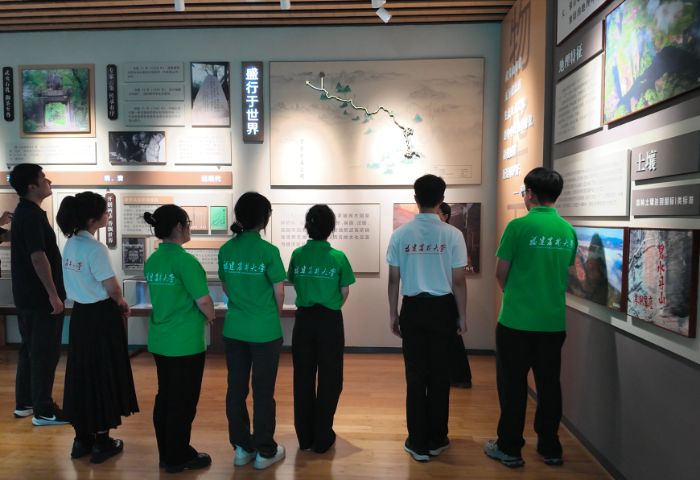 離開茶園,學(xué)員們來到燕子窠三茶統(tǒng)籌展示館。展館的玻璃幕墻映著遠(yuǎn)處的茶山,館內(nèi)以武夷山茶的歷史、發(fā)展成就和規(guī)劃為主線,像一本立體的茶書徐徐展開。拐角處的投影展現(xiàn)了武夷茶從古至今的發(fā)展歷程,從神農(nóng)嘗百草時茶芽初綻的驚喜,到唐代煎茶的溫潤、宋代點(diǎn)茶的雅致,再到明清沖泡的閑逸,武夷巖茶在時光長河中不斷蛻變。這片葉子跨越了千年的歷史長河與我們相遇,它不僅是大自然的饋贈,更是武夷市人民致富的金葉。
