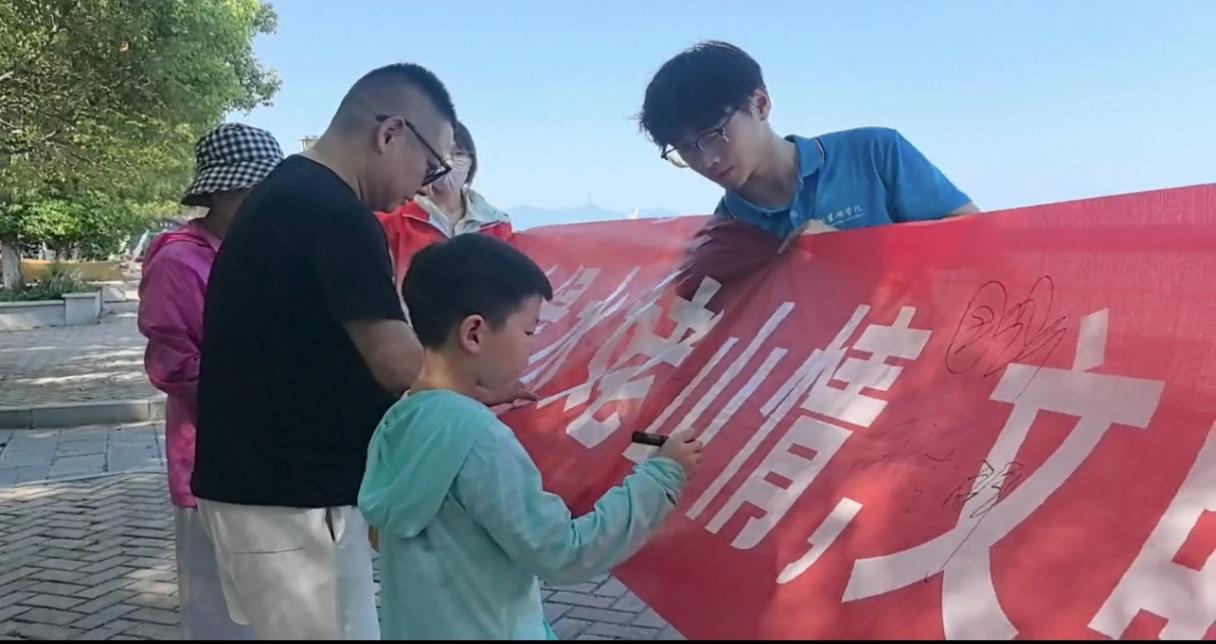 實(shí)踐之旅中,一場(chǎng)別開生面的文明旅游宣傳活動(dòng)成為靚麗風(fēng)景。橫幅承諾,成員們拉起"青山綠水姥山情,文明旅游共踐行"的橫幅。熱情邀約,積極邀請(qǐng)游客與居民簽名,普及文明出游知識(shí),倡導(dǎo)愛護(hù)環(huán)境、尊重文化。落筆擔(dān)當(dāng),游客紛紛響應(yīng),鄭重簽名,許下"文明旅游,從我做起"的承諾。實(shí)踐團(tuán)以實(shí)際行動(dòng),為姥山島旅游發(fā)展注入文明新風(fēng)。