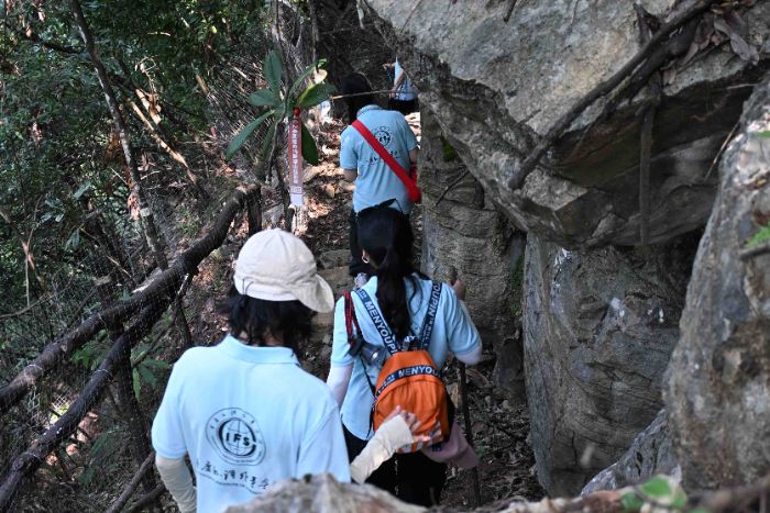 穿越溶洞,實踐團沿著甘香峽谷溪流繼續(xù)前行。隊員們還與沿途游客進行交流,收集他們對徒步路線的體驗反饋與改進建議。徒步期間,團隊成員們發(fā)現(xiàn)步道周邊存在白色垃圾,自發(fā)取出隨身攜帶的垃圾袋,拾起掉落在山間溪邊的塑料瓶、食品包裝袋,將“潔小青”的理念落到實處。