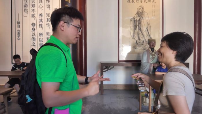 武夷精舍作為朱熹親手創(chuàng)建的書院,是實(shí)踐團(tuán)探尋朱子文化與茶文化交融的重要站點(diǎn)。這座古樸雅致的建筑群內(nèi),“序言”“朱熹一生、不同凡響”等6個(gè)展區(qū)系統(tǒng)呈現(xiàn)了南宋理學(xué)大家的生平軌跡與思想脈絡(luò)。成員們?cè)?ldquo;序言”區(qū)駐足凝視朱熹講學(xué)場(chǎng)景的復(fù)原模型,耳畔仿佛回蕩著“為學(xué)之實(shí),固在踐履”的諄諄教誨;在“朱熹一生”展區(qū),通過泛黃的古籍復(fù)刻本、詳實(shí)的生平年表,深入了解他歷任地方官時(shí)興修水利、興辦教育的政績(jī),尤其對(duì)其“治家嚴(yán)而有法”的家訓(xùn)與“以茶明志”的生活態(tài)度感觸頗深。從‘格物致知’的治學(xué)理念到‘茶如君子’的隱喻,朱子思想中對(duì)‘理’與‘德’的追求,和當(dāng)代‘三茶統(tǒng)籌’中茶文化的精神內(nèi)核一脈相承。