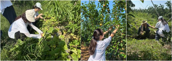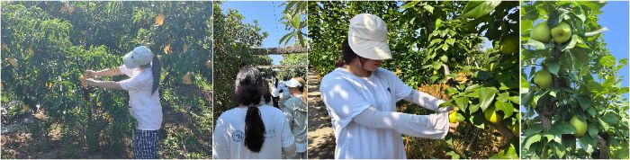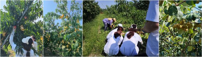 在果園走訪過程中,成員們想要親身體驗果農(nóng)的日常作業(yè),有果農(nóng)爺爺在旁邊指導(dǎo),團隊成員參與枝葉修剪、疏果、抹芽、采摘等農(nóng)事操作。頂著烈日,即使簡單的農(nóng)活,也很快汗流浹背,而果農(nóng)爺爺依舊在沉浸式講解,成員們深切體會到果園日常管理的繁瑣與辛勞,紛紛表示農(nóng)業(yè)調(diào)研活動的必要性及助農(nóng)愛農(nóng)的重要性。