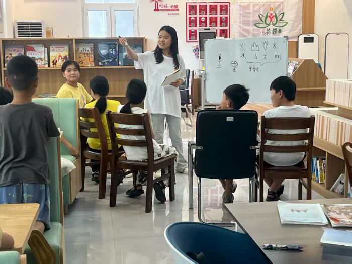 傳統(tǒng)文化課堂上,“甲骨文探秘”成為孩子們的“啟蒙鑰匙”。志愿者通過動畫演示“日”“山”等漢字的演變軌跡,讓抽象的文字起源變得生動可感。孩子們手握彩筆還原甲骨文形態(tài),在涂畫中觸摸中華文明的根脈,文化認同的種子在心中悄然萌發(fā)。