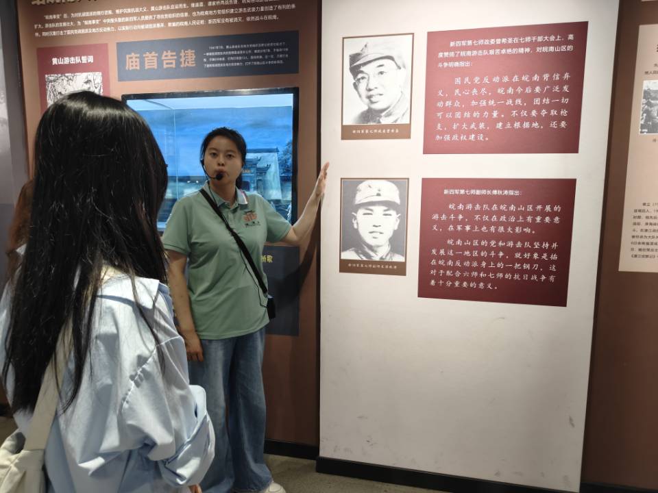 實踐隊員在晨光中抵達巖寺新四軍軍部舊址,首先映入眼簾的是莊嚴肅穆的紀(jì)念館。在講解員的帶領(lǐng)下,實踐隊員依次參觀了紀(jì)念館的各個展廳。從“巖寺集結(jié)”到“誓師東進”,從“軍民情深”到“抗日烽火”,再到“鐵軍傳承”,每個展廳都通過豐富的歷史圖片、珍貴的革命文物和生動的場景復(fù)原,再現(xiàn)了新四軍在巖寺的奮斗歷程和英勇事跡。