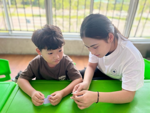 團(tuán)隊依托“春芽”“夏螢”“秋實(shí)”“冬爐”四支小隊,自7月11日起深入日照市四所幼兒園。他們打破傳統(tǒng)志愿活動模式,針對孤獨(dú)癥兒童認(rèn)知特點(diǎn),開發(fā)出分級教學(xué)體系:從基礎(chǔ)折紙訓(xùn)練手眼協(xié)調(diào),到創(chuàng)意拼貼激發(fā)表達(dá)欲。