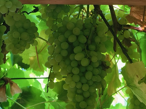 (圖為葡萄溝種植園內(nèi)成熟的葡萄串,晶瑩剔透的果實(shí)掛滿藤架)